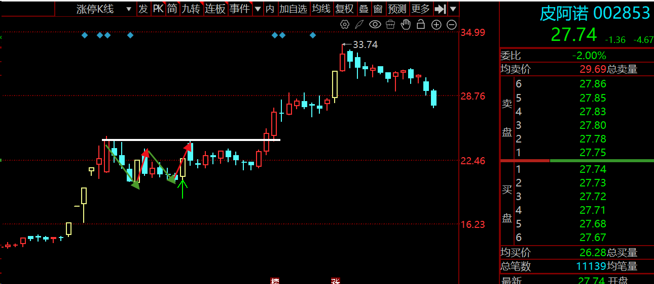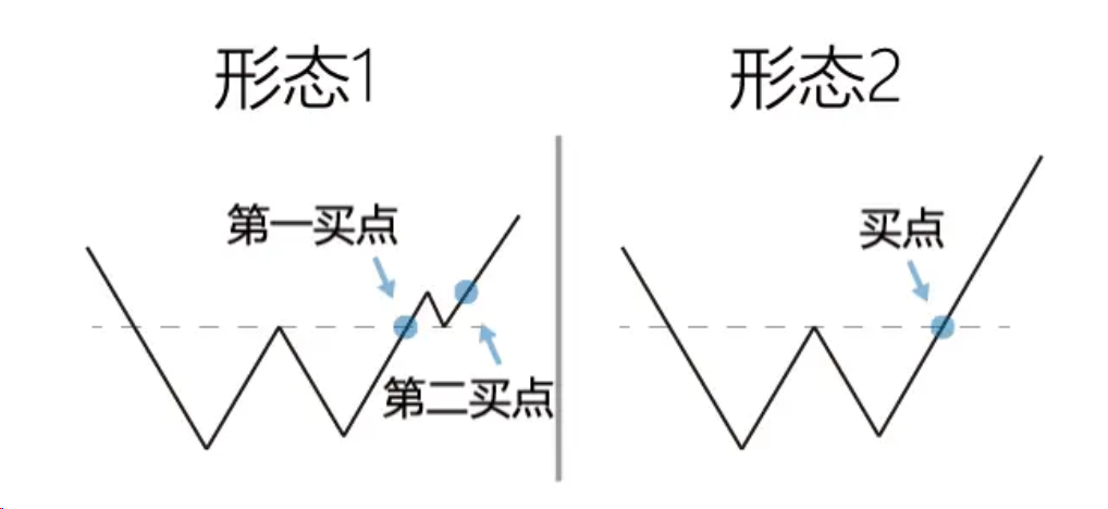 若以形态1的方式突破,那么突破颈线时为第一买点,但这时候买风险比较大,要准备好随时离场;而当股价突破颈线回抽,试探颈线支撑有效,此时的点位为第二买点,这种做法更为稳健,但获利机会相对较小。若以形态2的方式突破,则突破颈线时为买点。