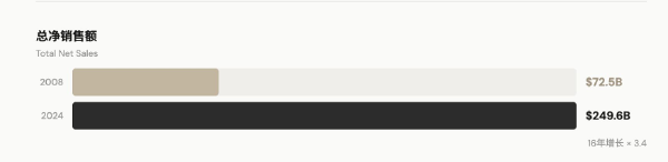 从2008年到2024年,16年的时间,Costco的总净销售额从725亿美元,增长到了2496亿美元。
