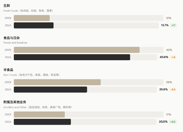 数据来源:Costco年报,2008年与2024年年报的品类口径有所不同。2008年分为6个品类,2024年合并为4个。为便于对比,将2008年的Sundries+Food合并为“食品与日杂”,Hardlines+Softlines合并为“非食品”。