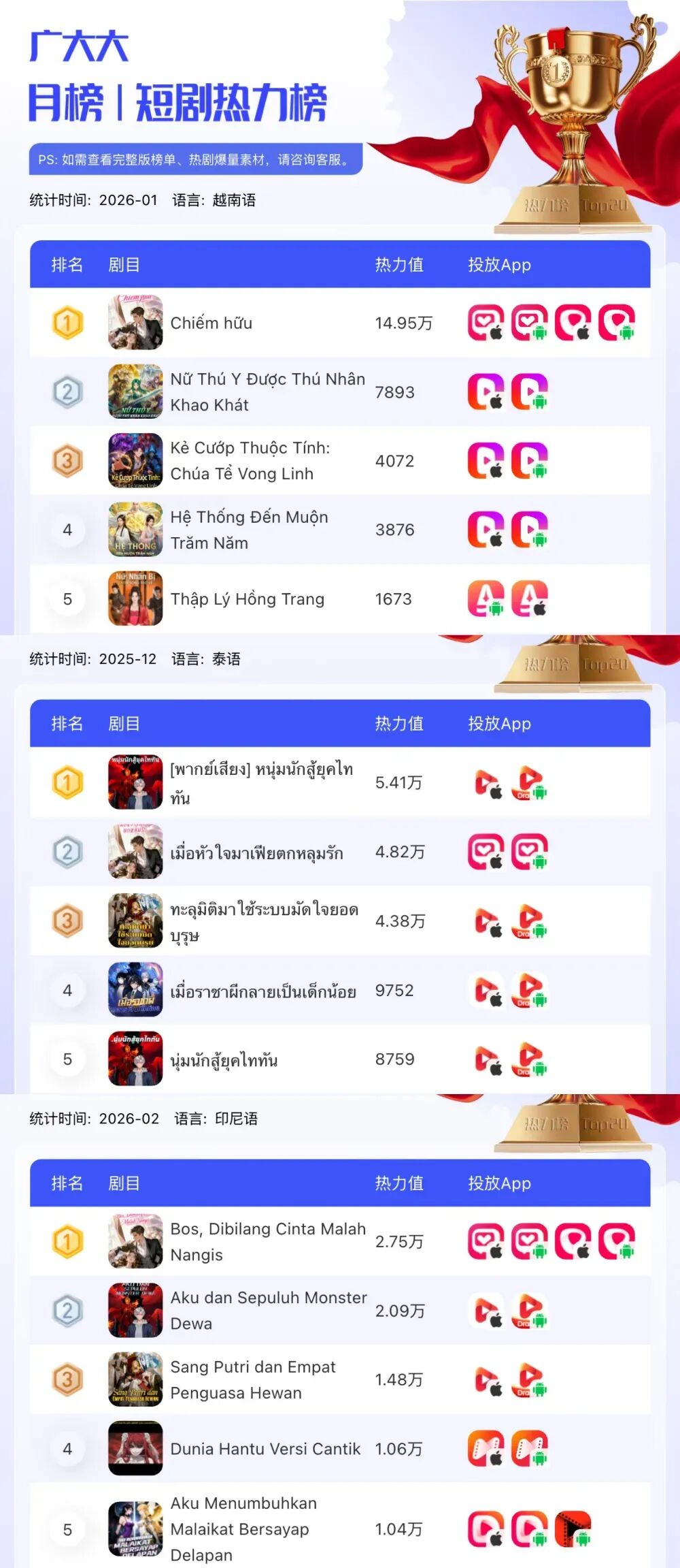 据广大大数据,去年11月开始泰国、印尼就有漫剧在投放,今年2月,泰语、马来语、越南语、印尼语漫剧TOP20的总热力值达70万,目前东南亚地区总在投漫剧953部。其中排名前列的有女频霸总题材《完蛋!大佬逼我分手》,也有男频奇幻剧《泰坦时代:我觉醒了十凶》。