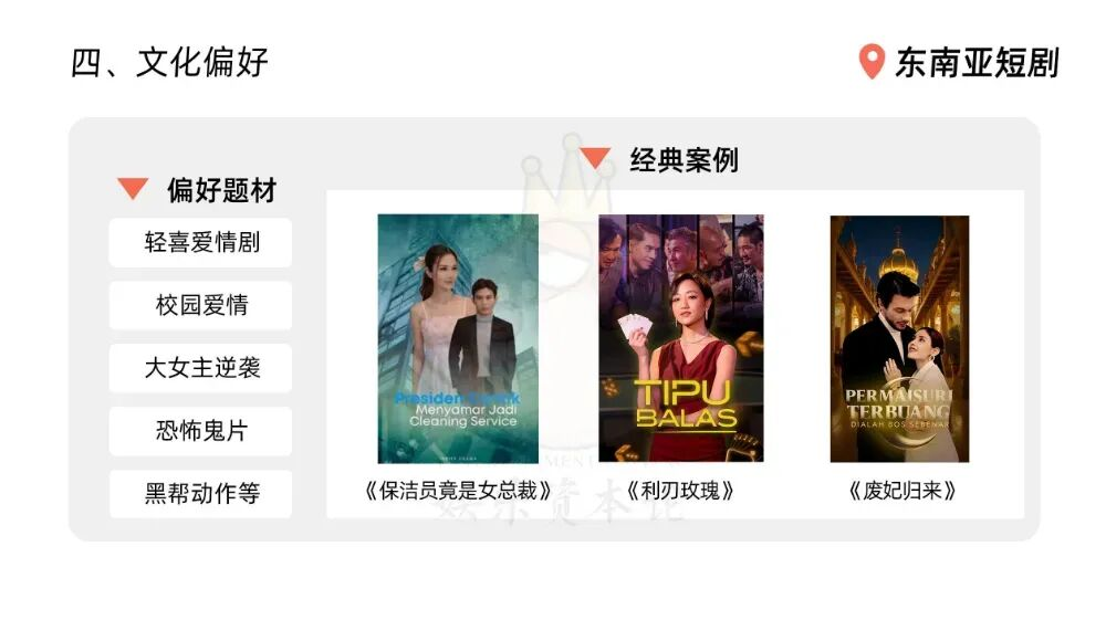 易漾光橙主要发行译制剧,杨柳发现,东南亚短剧受众以18~35岁年轻女性为主,因此爱情喜剧、甜宠、古装以及大女主爽剧在东南亚市场更受欢迎。特别是东南亚市场对青春校园剧需求旺盛,但国内产能不足,只能依赖本土原创。