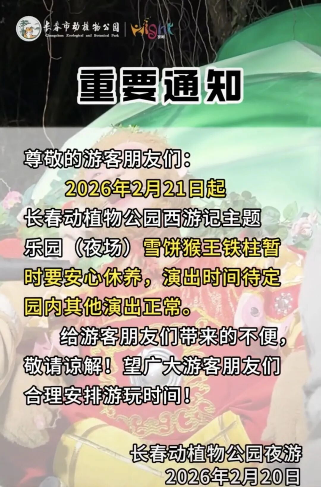 (长春动植物公园发布公告)