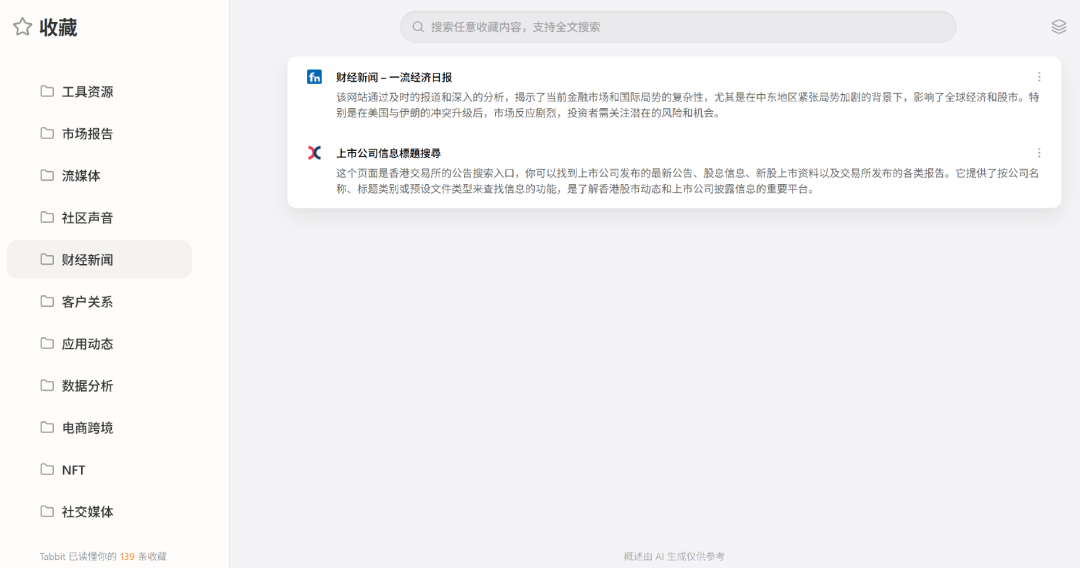在笔者导入原来Chrome数据,并调用Tabbit的标签页/收藏夹智能分组功能后,它用了几分钟,帮我把一百多个网址分类放进科技报道、财经信息、市场报告等十几个收藏夹中,点开每个收藏夹,还能看到AI对各个网页的信息作出解析,方便用户按需查找。