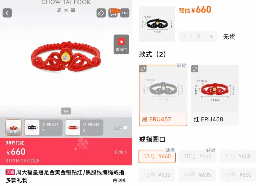 0.1g足金的周大福皇冠编绳戒指火速卖光,金店一边镶钻、编绳、做皇冠造型,一边轻轻卖出微量黄金。