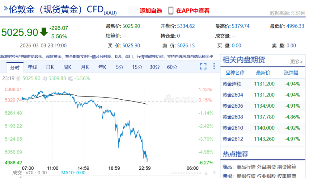 美国和以色列2月28日对伊朗发起军事打击,引发中东地缘政治局势显著升级,使得市场避险情绪攀升,引发金价巨震。3月2日开盘后国际金价上涨,伦敦金截至3月3日下午1点40分时超过5330美元/盎司。然而此后却又直线跳水,一度跌破5000美元/盎司,截至发稿报5025.9美元/盎司。