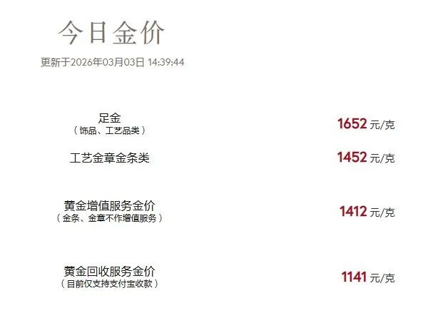 记者注意到,截至3月3日下午2点39分,周大福官网显示,工艺金章金条类价格为1452元/克,黄金回收价格为1141元/克。