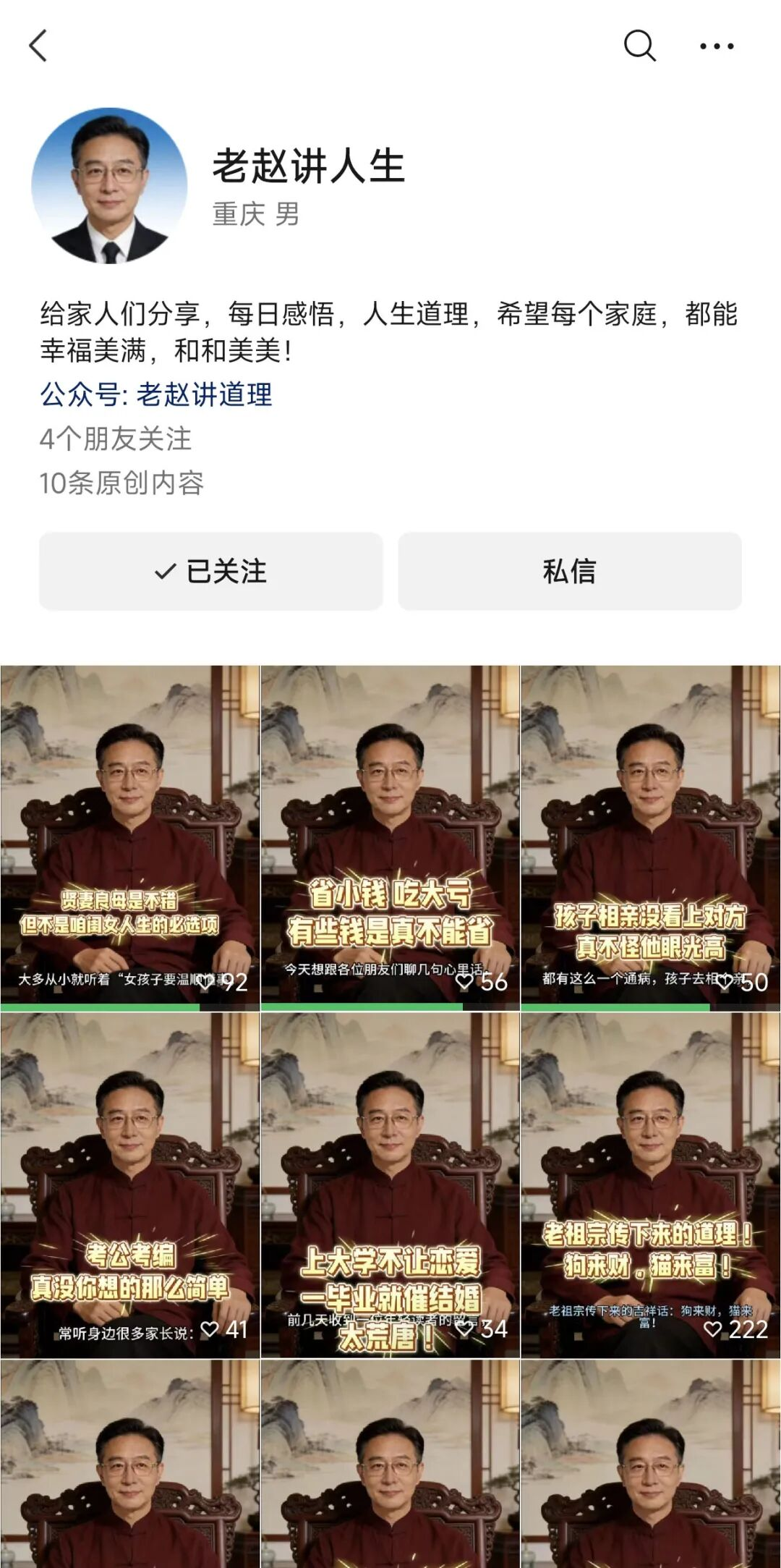 不久前,“是草莓味的猫”还开了新号“郑姐谈家庭”,画风和“老赵讲道理”如出一辙,主攻育儿、婆媳、中年女性等话题。层出不穷的账号不断壮大着反毒鸡汤赛博专家的队伍。