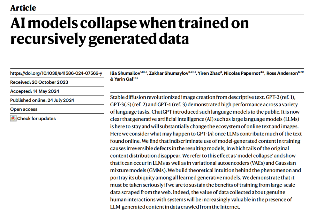 第二层循环是当AI开始“自己生自己”。如今大模型已广泛用于生成合成数据,如用GPT-4生成的问题和答案训练下一版模型。看似数据无限、成本归零、模型自我进化,但研究发现这种“自我繁殖”有致命隐患——模型崩溃(Model Collapse)。2024年,《Nature》发表的一项研究指出:如果AI模型连续在“自己生成的数据”上训练超过5轮,就会出现模型崩溃。表现包括:重复同一句话、开始说“胡话”、忘记稀有知识(比如少数民族语言、冷门疾病)、输出越来越“平庸”或“离谱”。