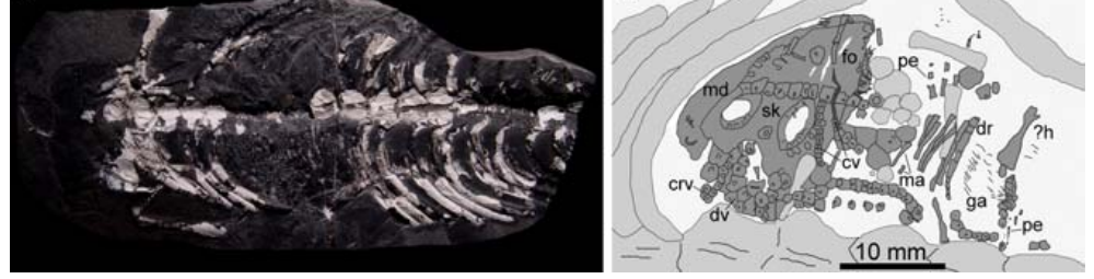 图注:弓龙母体及其子宫内的胚胎。左:标本的真实照片;右:线条示意图,母体以浅灰色表示,幼体以深灰色表示。