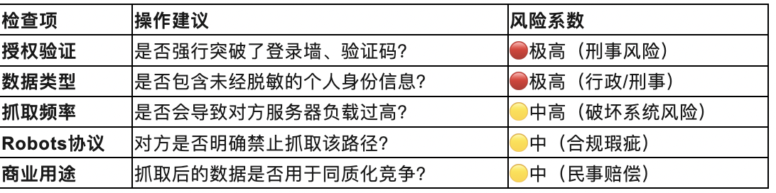 律师提醒:抓取公开信息(如微博公开言论)相对安全,但如果涉及大量用户画像、私密社交关系,必须立即停止。