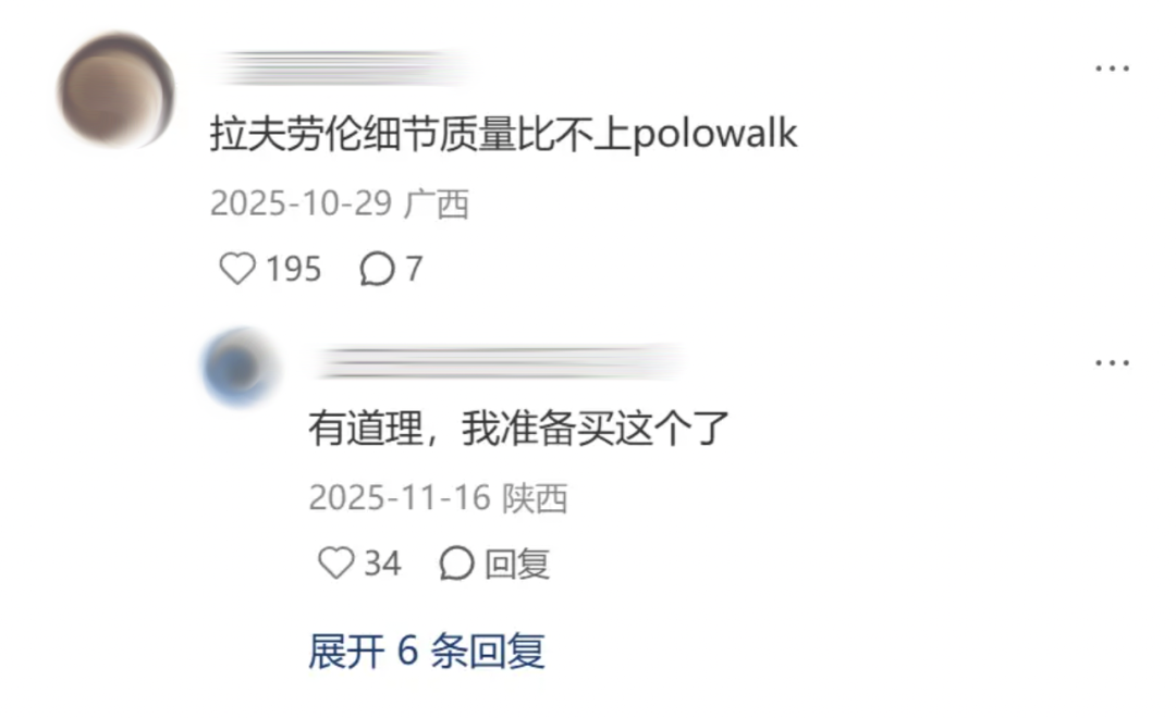 甚至,同时拥有正品和POLOWALK的“叛逆中产”们,会把POLOWALK与拉夫劳伦放在一起对比,而对比的结论是,“细节不输拉夫劳伦”。