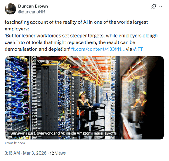 亚马逊计划年度支出超过1000亿美元,然而大部分都砸进了数据中心和AI芯片。人力专家邓肯·布朗(Duncan Brown)在社交媒体X上评价道:“一边压榨员工设定更高目标,一边把钱投给可能取代他们的工具,这简直是士气杀手。”
