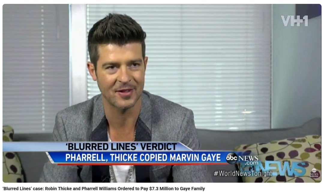 Pharrell和Robin Thicke热门单曲Blurred Lines被Marvin Gaye家族后人起诉侵权,经过长期诉讼程序,最终赔偿730万美金赔偿。