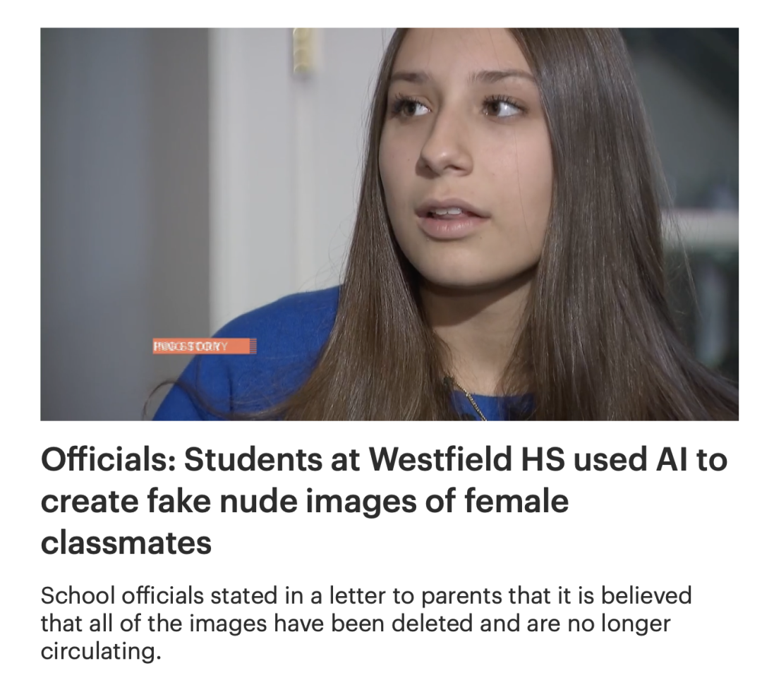 此类事件不胜枚举,比如在新泽西州的韦斯特菲尔德高中,一个典型的美国中产阶级学区,却爆发了震惊全美的丑闻:一群看起来「品学兼优」的男生,利用AI生成了多达三十多名女同学的虚假暴露图片照,并在私密群组里像交换棒球卡一样流传。
