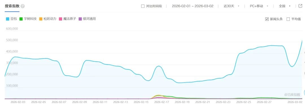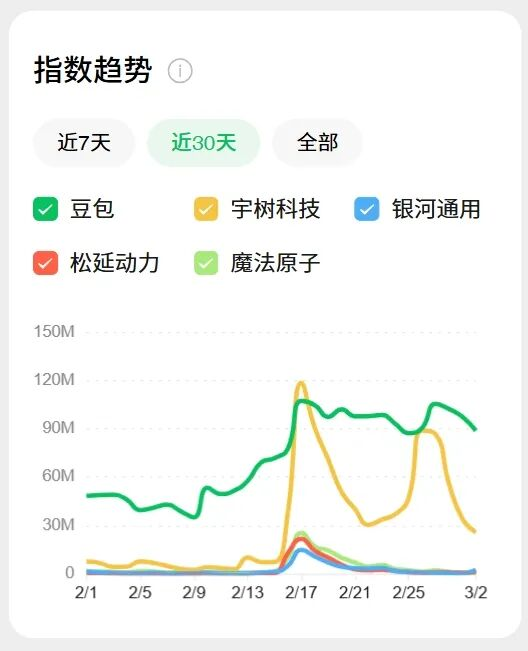 先看百度指数:四家公司在除夕和初一这两天,搜索量集体冲上高峰。从大年初二开始,齐刷刷往下掉。到2月中旬,基本都回到了春晚之前的水平。特别是除了宇树之外的三家,几乎没有留下任何痕迹。
