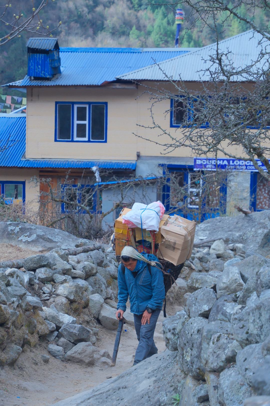 沿途住宿以高山客栈为主,浪漫的是被雪山环抱的自然风光,而不是硬件设施。当地物资运输困难,全靠人托和少量的马帮,所以除了背负徒步者物资,沿途你甚至能看到当地人背煤气罐、背门板等等。