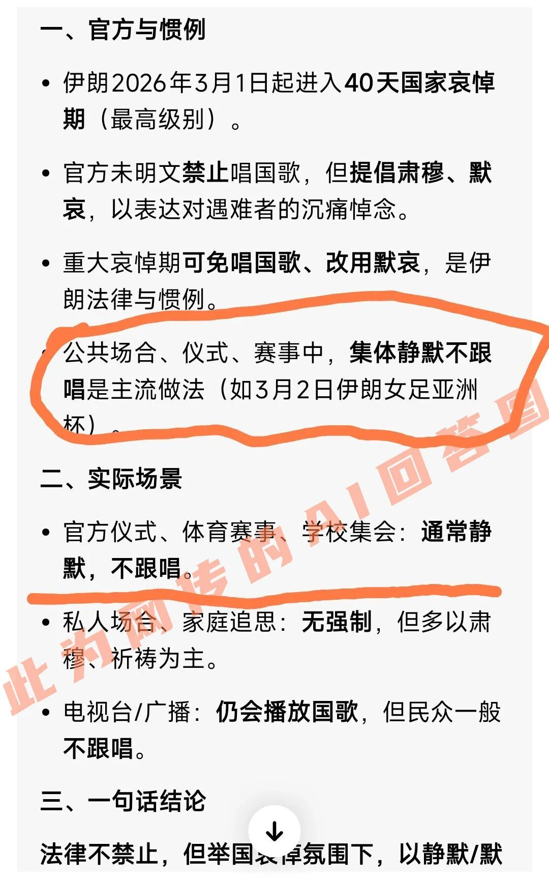 这是一张AI风格的回答截图。事实上,第二轮,伊朗女足与澳大利亚的比赛,伊朗姑娘们集体敬礼,高唱国歌。
