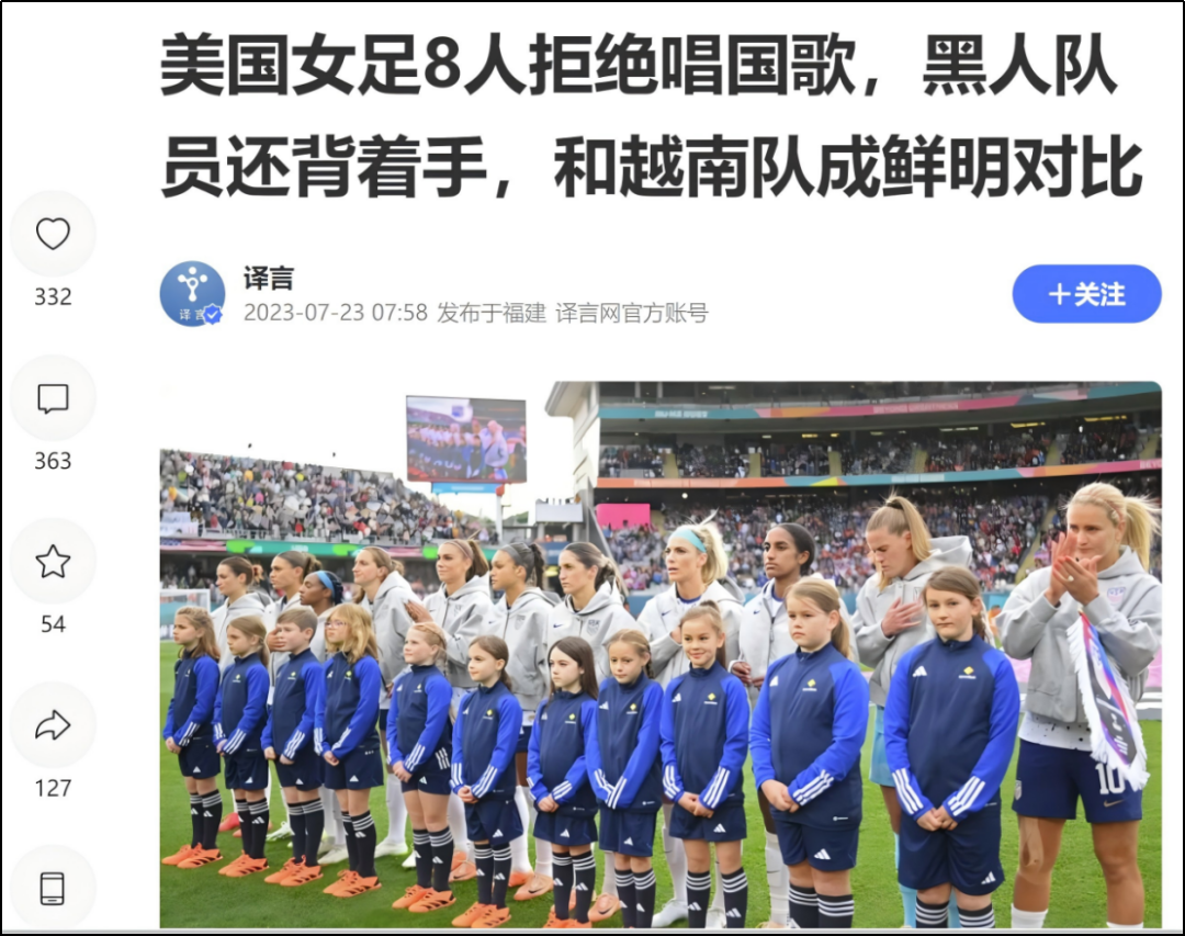 上一届女足世界杯,美国女足里有一些球员多次拒唱国歌,一些美国人认为她们傲慢得都快不爱国了。