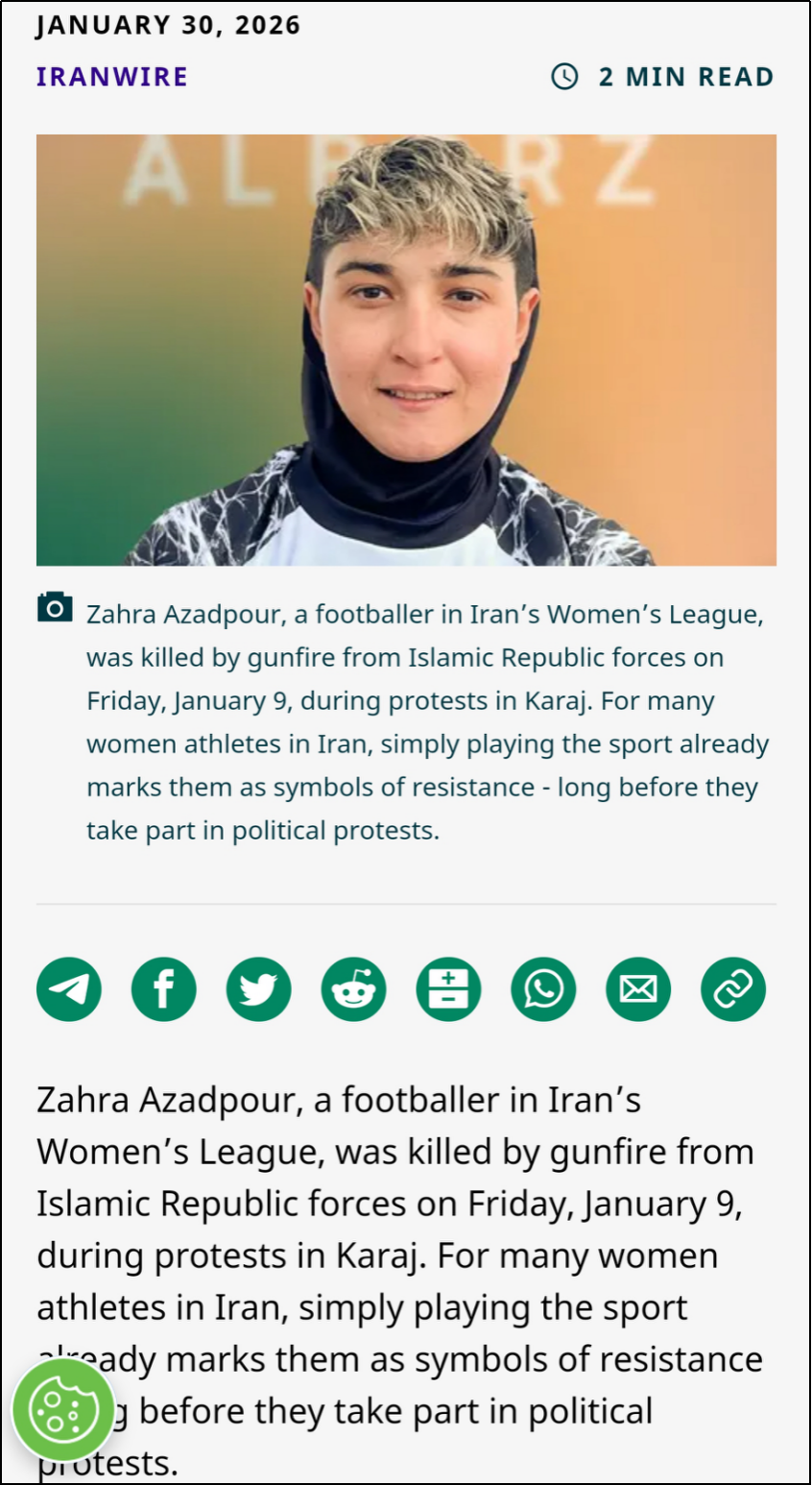另一种说法是为同行的不幸遇难而哀悼。新闻报道说伊朗女子联赛中的一名球员在1月9日参加了当地的抗议活动,但被枪击身亡。
