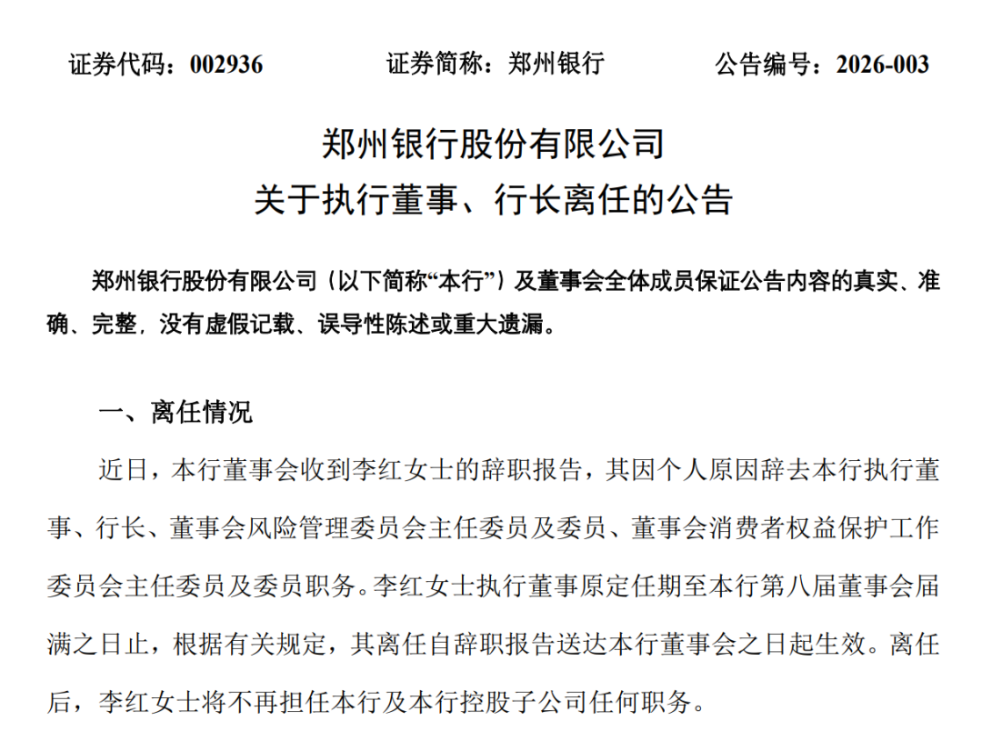 2026年2月12日,郑州银行公告称,行长李红因“个人原因”辞职。