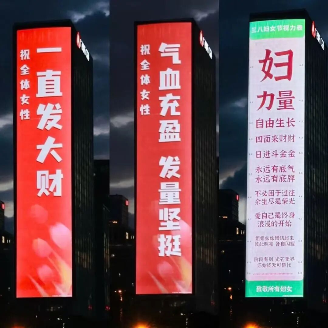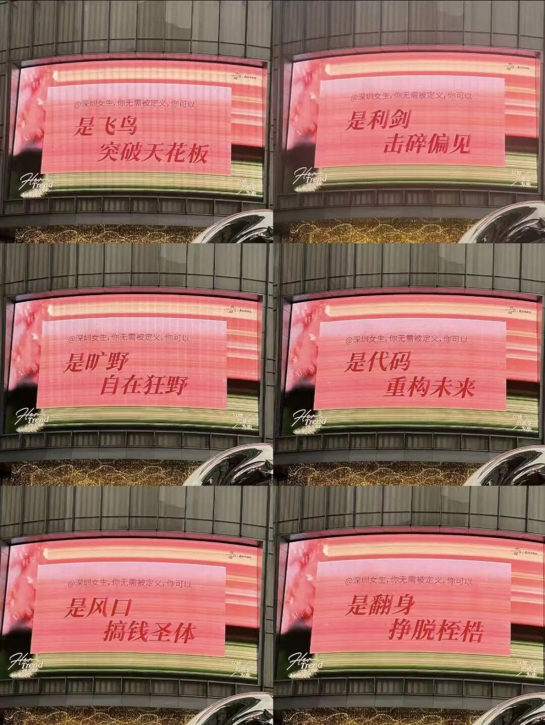 最近,如果你在深圳街头,抬头看,大概率能看到许多大荧幕上写着对女生的祝福,这些句子简短有力、坚毅鼓舞。