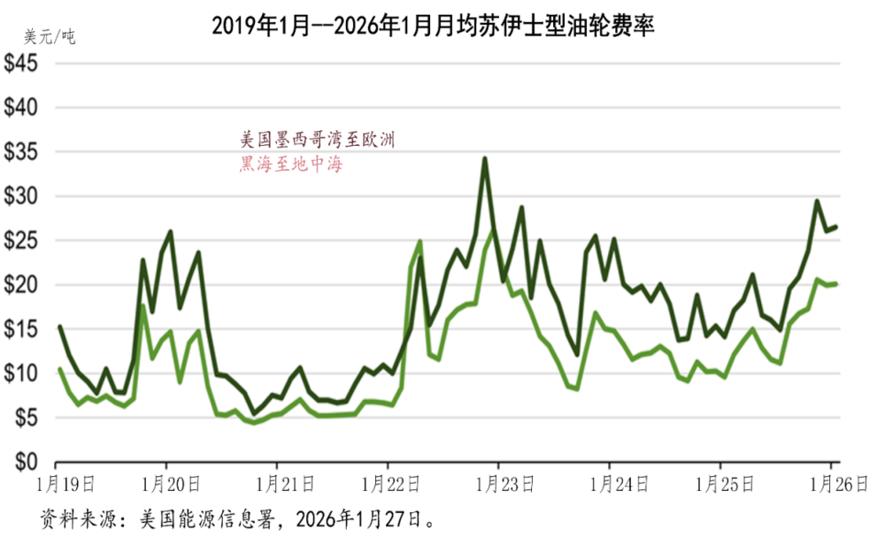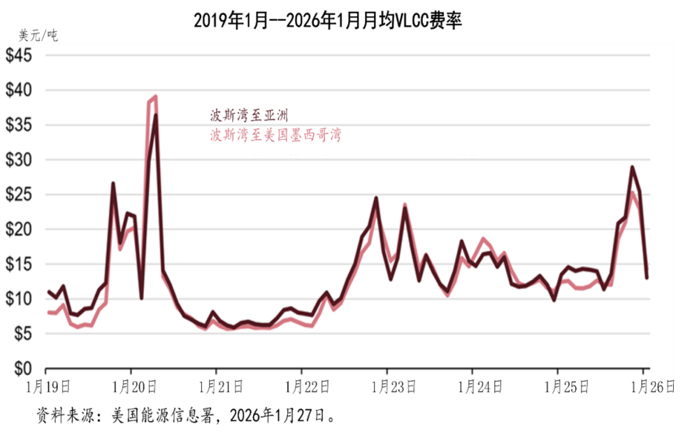 2026年1月,受季节性因素影响,油轮运价下跌,随后因对美伊紧张局势的地缘政治担忧而再次上涨。