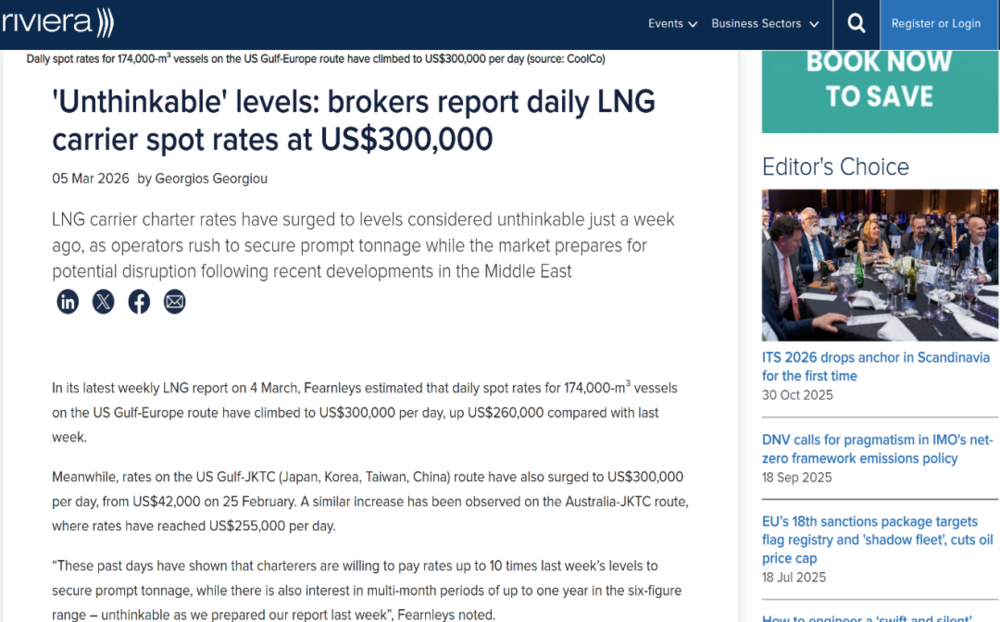 根据里维埃拉海事媒体(Riviera Maritime Media)引用的船舶经纪公司费恩利斯最新的液化天然气船周报,美国墨西哥湾至欧洲航线17.4万立方米液化天然气运输船的日即期租船费率,已攀升至约每天30万美元,较上周上涨约26万美元。覆盖日本、韩国、台湾和中国大陆的美国墨西哥湾至亚洲航线日费率,也从2026年2月25日的4.2万美元飙升至每天30万美元,而澳大利亚至亚洲航线的日费率则升至约每天25.5万美元。其中,仅2026年3月2日一天,一艘液化天然气运输船的日租金就飙升了40%。