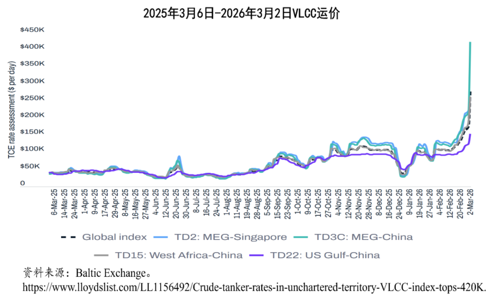 根据波罗的海交易所的TD3C MEG-China指数,2026年3月2日,周一,能够运输约200万桶原油的超大型原油运输船的日租金创下历史新高,达到423,736美元。据航运机构的报道,创下这一运价费率历史新高的,是3月2日当天中东至中国的航线,因为中东的战争扰乱了世界上最繁忙、最重要的航道霍尔木兹海峡,一艘运载原油的超级油轮运费达到每天42万美元以上。