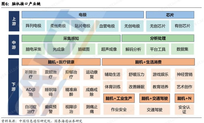 其中上游主要涵盖电极、芯片等核心元器件,决定脑机接口的信号精度与稳定性,是技术壁垒最高、国产替代价值最大的环节。
