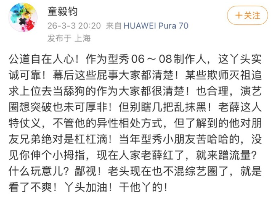 《我型我秀》曾经的制片人,暗指张杰欺师灭祖。