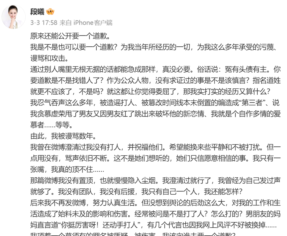 称自己明明是张杰感情背叛的受害者,却被造谣、网暴,多年来因为张杰处理感情的不当结果备受煎熬;