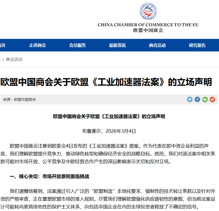 欧盟中国商会在声明中强调,中国在清洁能源、电动汽车和电池产业链等领域的优势,是长期市场竞争和充分创新的结果,而非不公平竞争的产物,同时指出法案中的限制性条款反而可能拖累欧盟自身的脱碳进程,导致欧洲失去优质合作伙伴与成本优势、中国企业面临市场准入不确定性的“多输”局面。