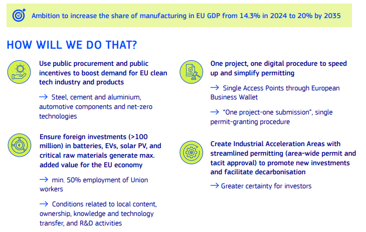 《工业加速法案》的前身是《工业脱碳加速法案》(Industrial Decarbonization Accelerator Act),后来去掉了“脱碳”二字,显示出欧盟目前更侧重于整体工业竞争力和再工业化。