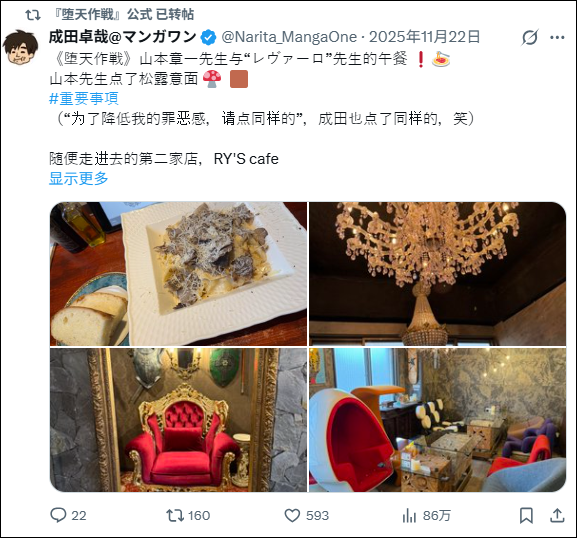 而Manga One不仅模糊化了《堕天作战》的断更理由,甚至将作品官号交给性犯罪者以个人号使用,宣传作品。有留意山本章一个人运营后留下的推文,会发现Manga One的编辑依然与他来往密切,推文中有不少二人聚餐时的照片。