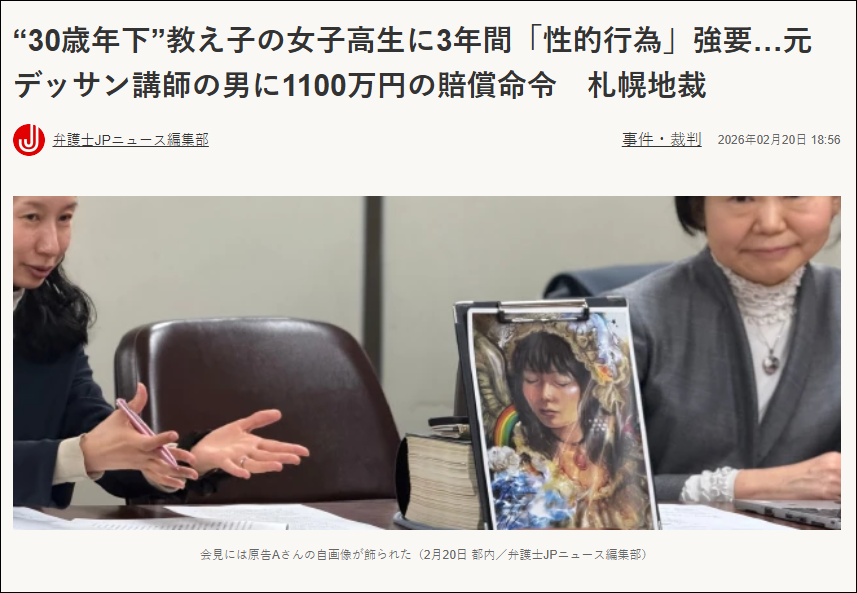 2026年2月20日,札幌地方法院就一起北海道高中教员性侵案作出判决,责命一名50多岁的前素描讲师向原告女性支付1100万日元赔偿。