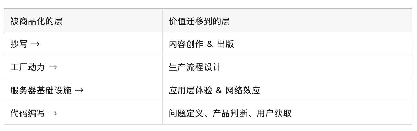 价值不会凭空消失,它只是迁移了。“复制”能力被商品化后,价值从“抄写”迁移到“内容创作”和“策展/发行”。出版商——而非印刷工——成为了新的权力节点。