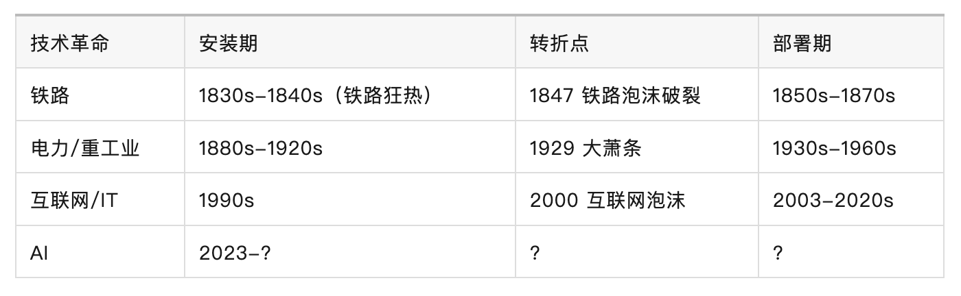 经济学家 Carlota Perez 提出了一个有影响力的框架,描述每一次技术革命都经历两个大阶段。