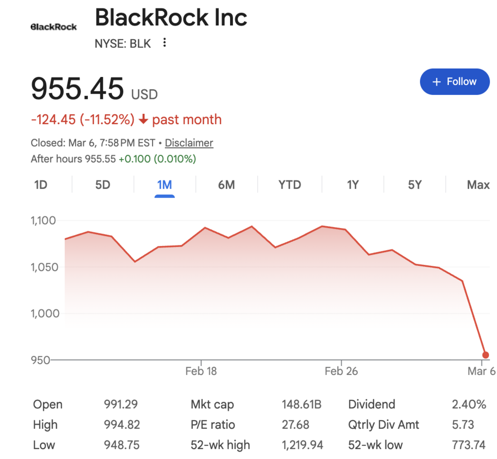 美国最主要投资机构的黑石私募基金遭遇大规模赎回,致其股价暴跌。