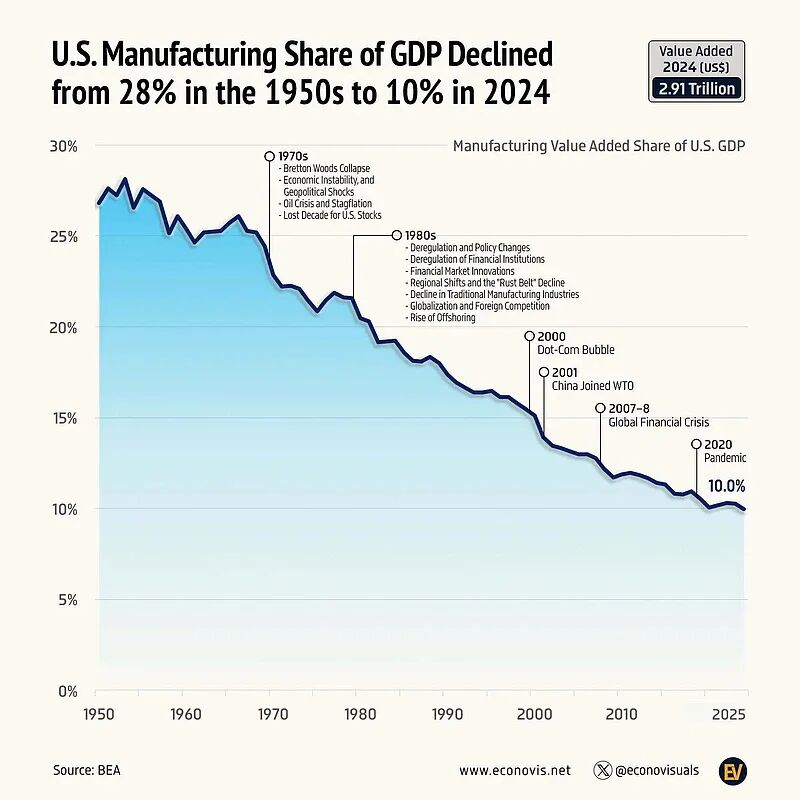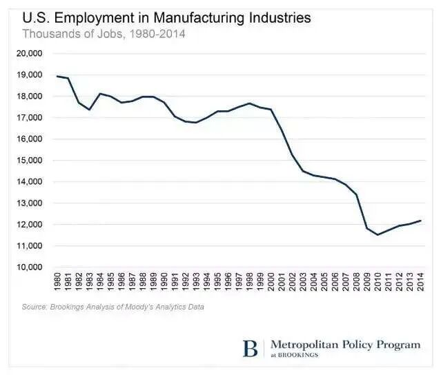 这个时期,也伴随着美国经济的高度金融化和虚拟化,始于80年代的跨国公司全球化配置资源导致美本土制造业外移,2001年中国加入WTO加速了美国经济“生产性”的失去。
