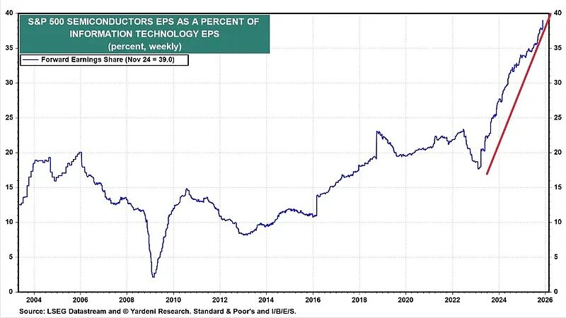 从2024年开始,半导体基建正在飞速吞噬整个IT产业利润,SP500里半导体净利润EPS在IT行业里占比,在两年时间从不到20%上升到了40%,而且还在呈加速上升姿态。