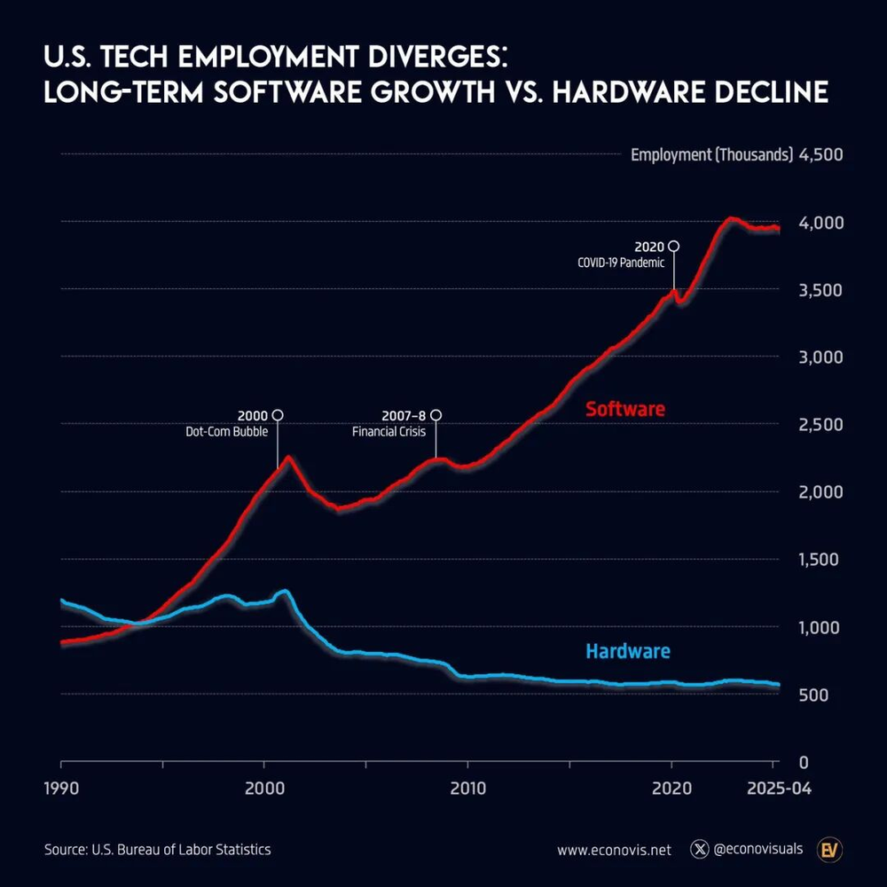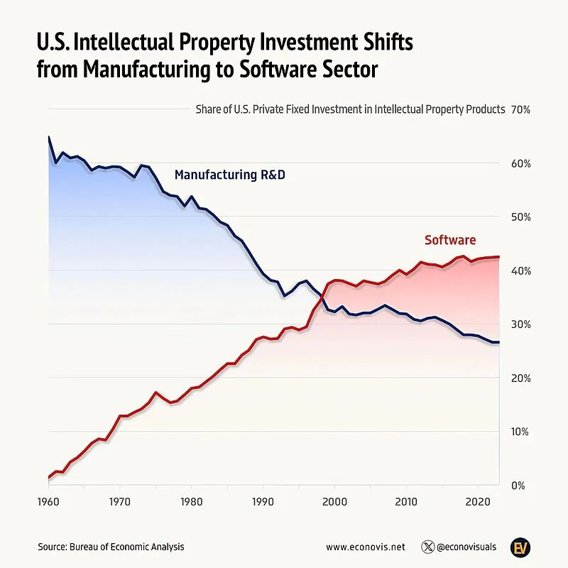 制造业在美国私人知识产权产品固定投资中的占比,从1960年的65%降至1990年的39%,到2023年进一步下滑至仅27%。与之形成对比的是,软件行业的投资占比从1960年的1.4%升至2000年的38%,并在2023年达到42%。