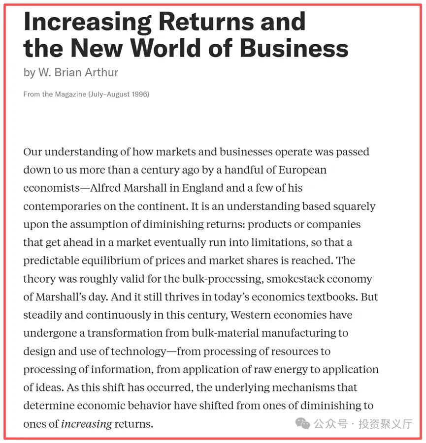 回顾这场投资范式,其重要的思想源头出自美国圣塔菲研究所Brian Arthur研究的复杂经济学的一个杀手级应用:收益递增经济学。其深刻解释了微软、谷歌、亚马逊等科技巨头的崛起逻辑,并被硅谷广泛接受为投资与创新的底层逻辑,也奠定了红杉、BG、Bill Miller投资框架。