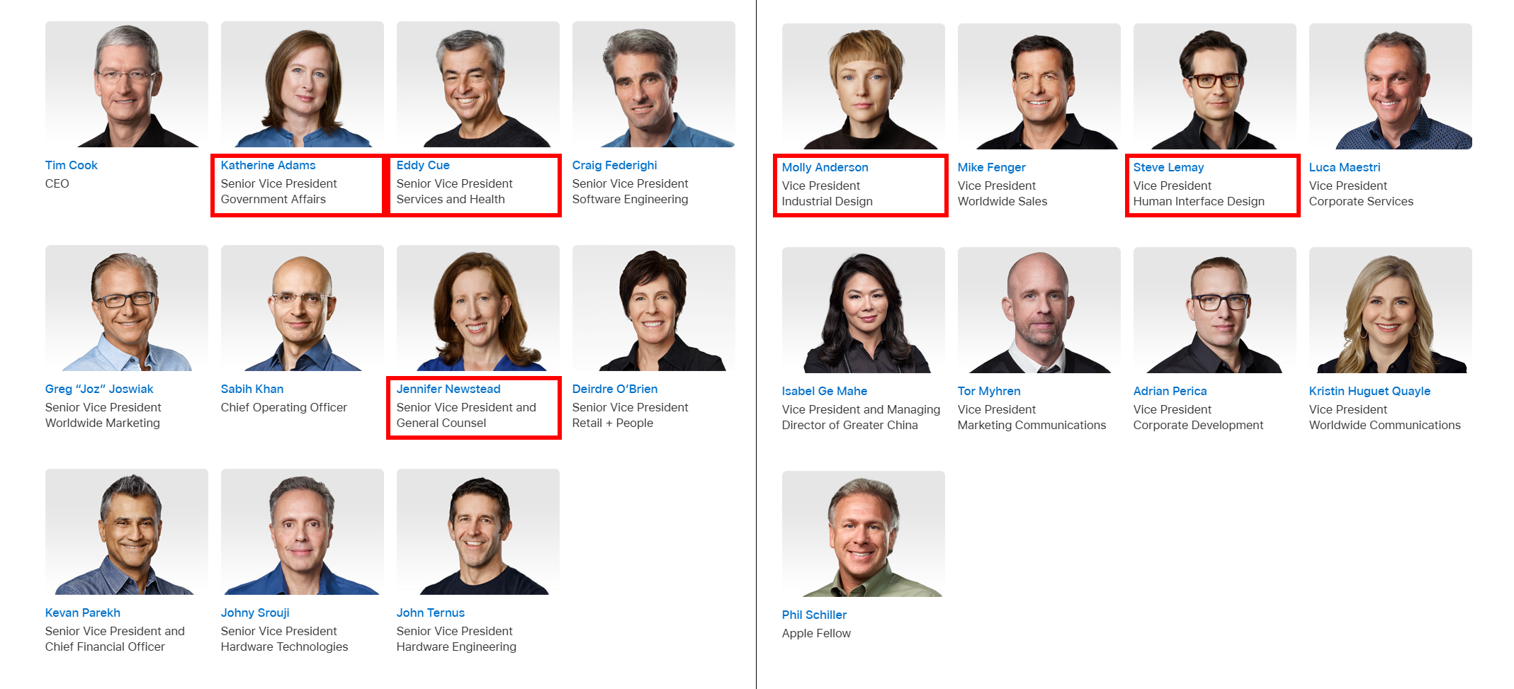 苹果管理层名单,左侧为官网页面上半部分,右侧为下半部分。图片来源:苹果官网