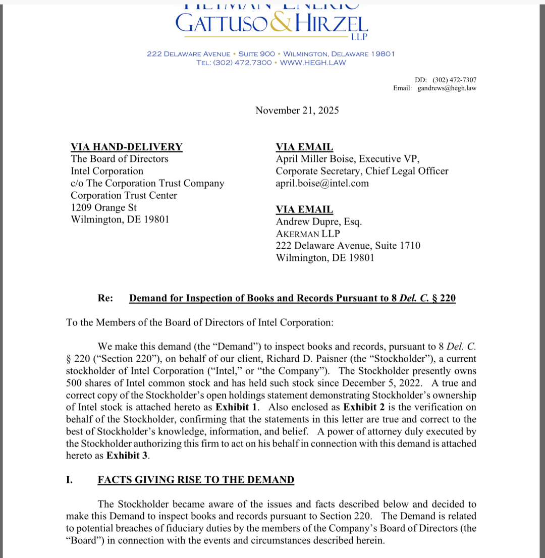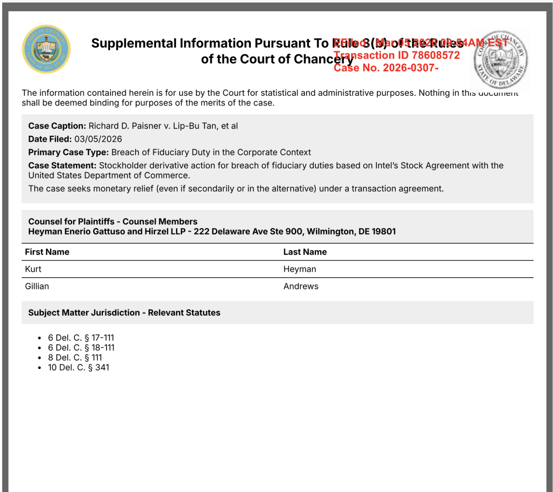 2026年3月5日,一份密封诉状递交特拉华州衡平法院。原告是英特尔普通股东理查德·佩斯纳,被告是英特尔CEO陈立武、美国商务长霍华德·卢特尼克,以及美国商务部本身。