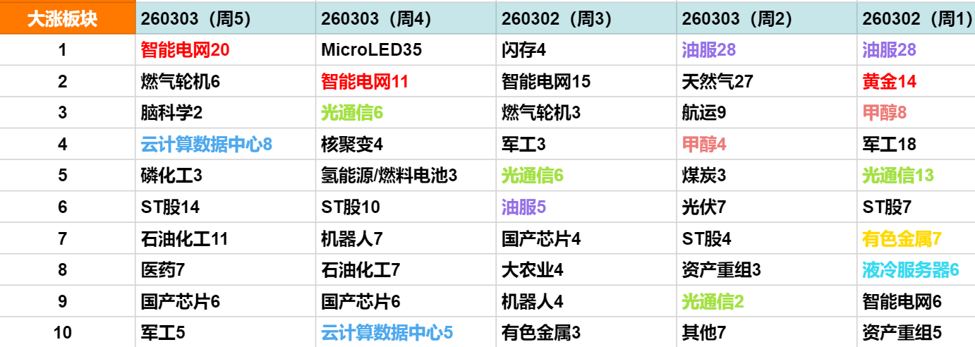 本周市场完成了从地缘避险(油气)→ 政策驱动((电网/算电协同)→ 涨价逻辑(化工)的快速轮动。
