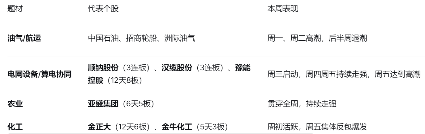前半周(周一至周三):油气/航运是绝对主线,但随着周二的分化和周三的巨震,亏钱效应显著。后半周(周四至周五):电网设备/算电协同接力成为新主线,梯队完整,持续性最强。