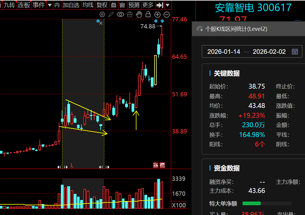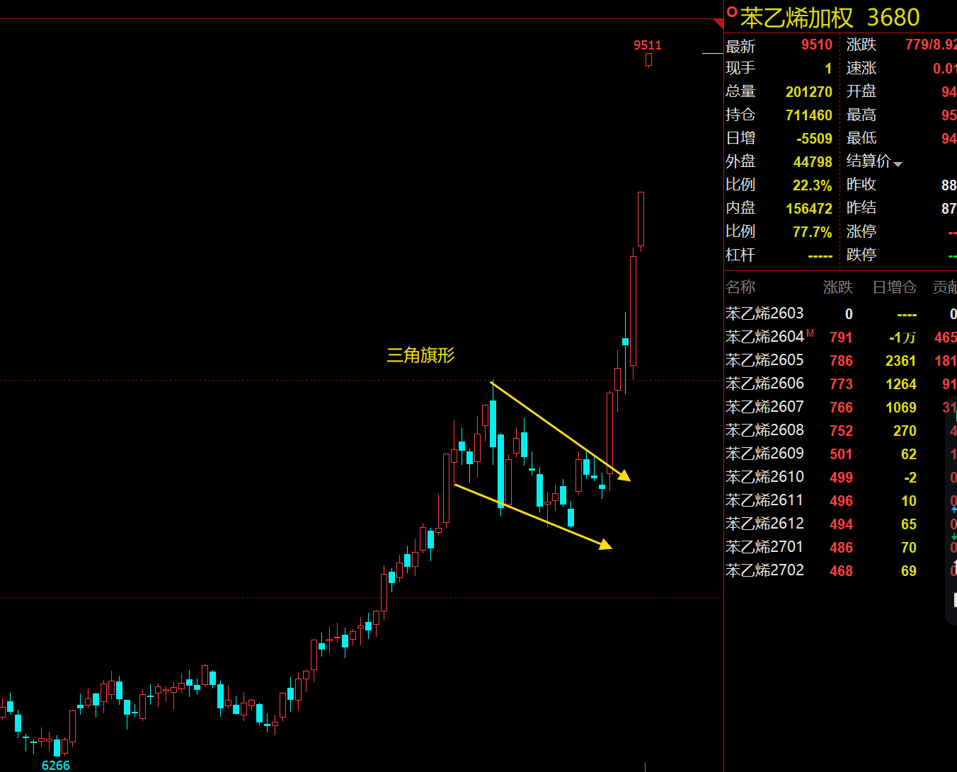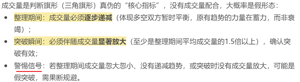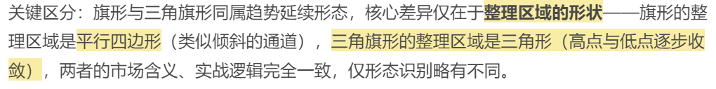 旗形(三角旗形)本质是“趋势中途整理形态”,核心特征是:先有一段陡峭的单边趋势(旗杆),随后出现一段窄幅整理(旗面/三角旗面),整理结束后,价格将延续原有趋势突破前行。