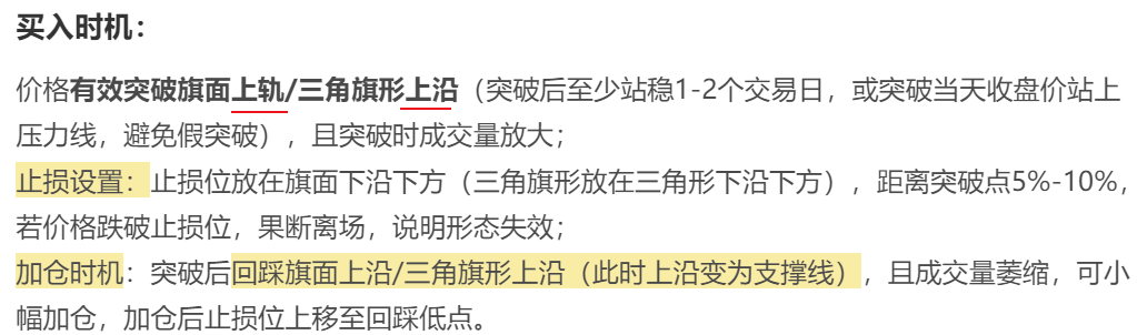 简单来说,它的形成逻辑的是:单边趋势中,多空一方力量强势推进(形成旗杆),随后部分投资者获利了结,另一方暂时蓄力,价格进入窄幅震荡整理(形成旗面);当整理到位、蓄力完成,原有趋势继续延续,形成突破行情。
