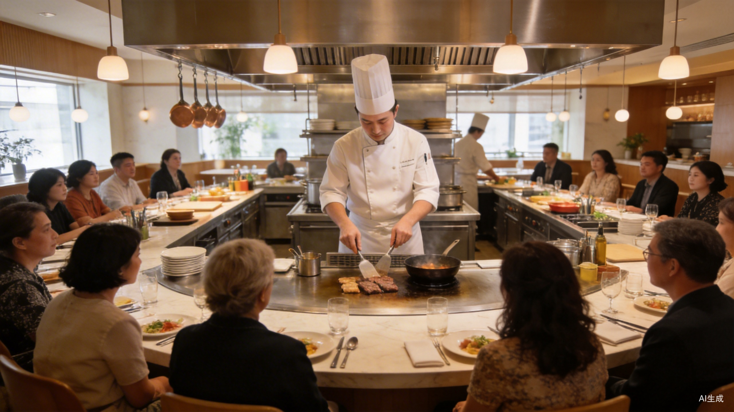 传统的日式明档也让你看着做菜。厨师在你面前捏寿司,铁板烧师傅把火焰抛向空中。但那是一种观赏——你是观众,他是表演者,界限分明。