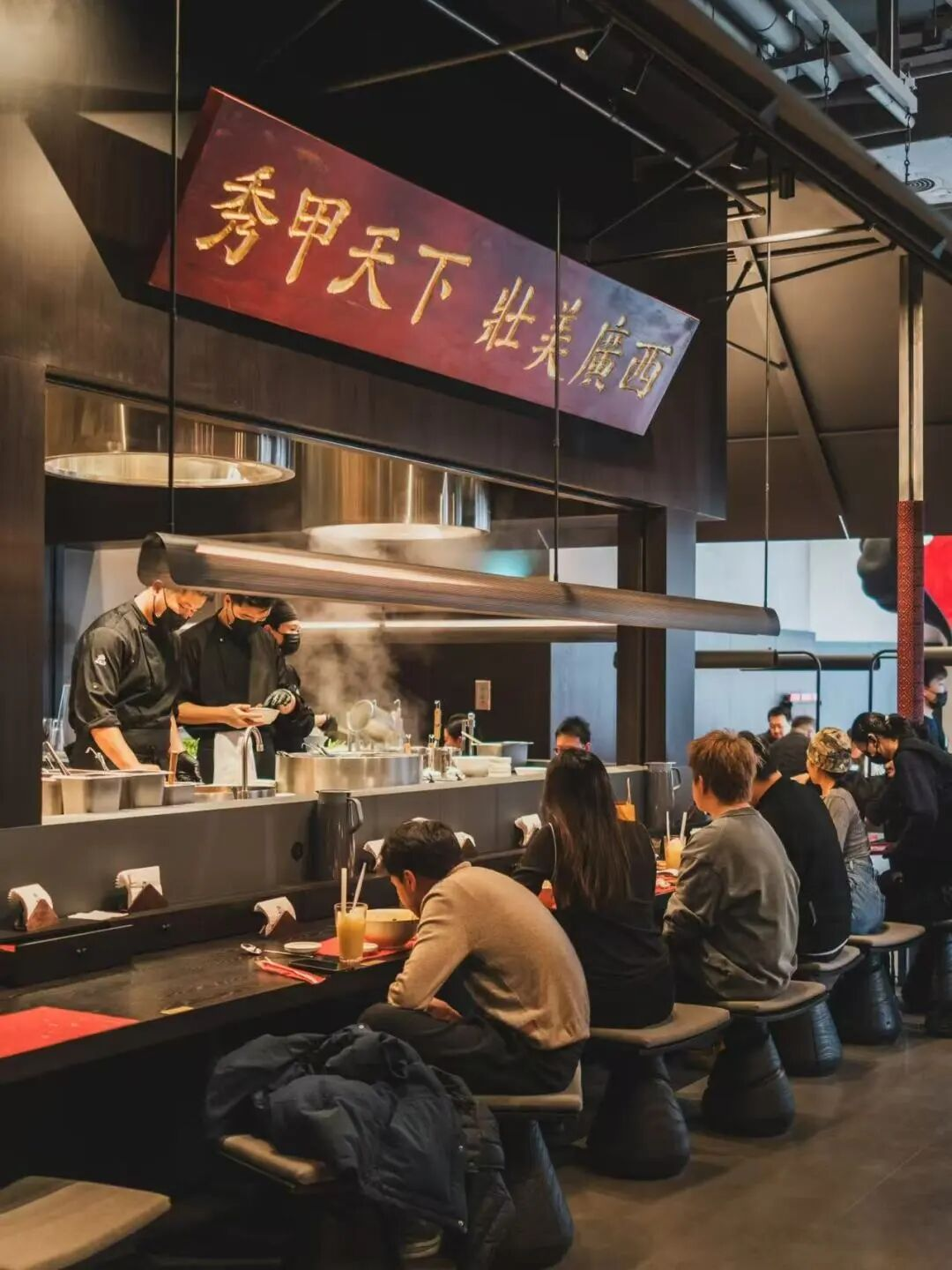 他们做了日式吧台椅,也做了深色隔板隔开的独立小间。明档区热气腾腾,充满了公共生活的热闹感——你看着师傅颠勺,听着滋啦声,闻到辣椒香,那是一人食也不孤单的尺度。